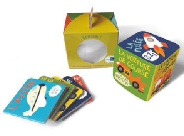 Le coffret est composé d’un dé en tissu, avec une clochette à l’intérieur, ainsi que de six petits livres. La thématique de l’ouvrage tourne autour des véhicules, ainsi un avion, un voilier, une fusée, un camion-benne, une voiture de course, ou encore, un camion de pompier sont à découvrir sur les facettes du dé, ainsi que sur les petits livres. Les enfants vont vite s’amuser à lancer le dé, qui va ainsi déterminer l’histoire à lire.