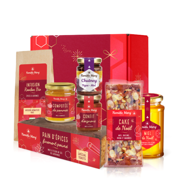 Et parmi nos coups de cœur, il y a sans aucun doute le « miel de Noël » à base de fleur d’oranger et de fleurs de citronnier, sans oublier le quartier de clémentine confite à l’intérieur qui fait son petit effet. Ainsi que l’incroyable « Cake de Noël » gourmand à souhait : ses amandes croquantes sur le dessus, le mélange miel et les raisins et son côté moelleux… Un délice ! Et n’oublions pas les fameux pains d’épices au miel à base de noix, de figues, de Guérande et de framboise. Enfin, pour ceux qui sont partisans de saveurs salées, Famille Mary propose également quelques mets sympas : moutarde bio au miel, vinaigre de miel et un confit d’oignon qui accompagnera à merveille votre foie gras.