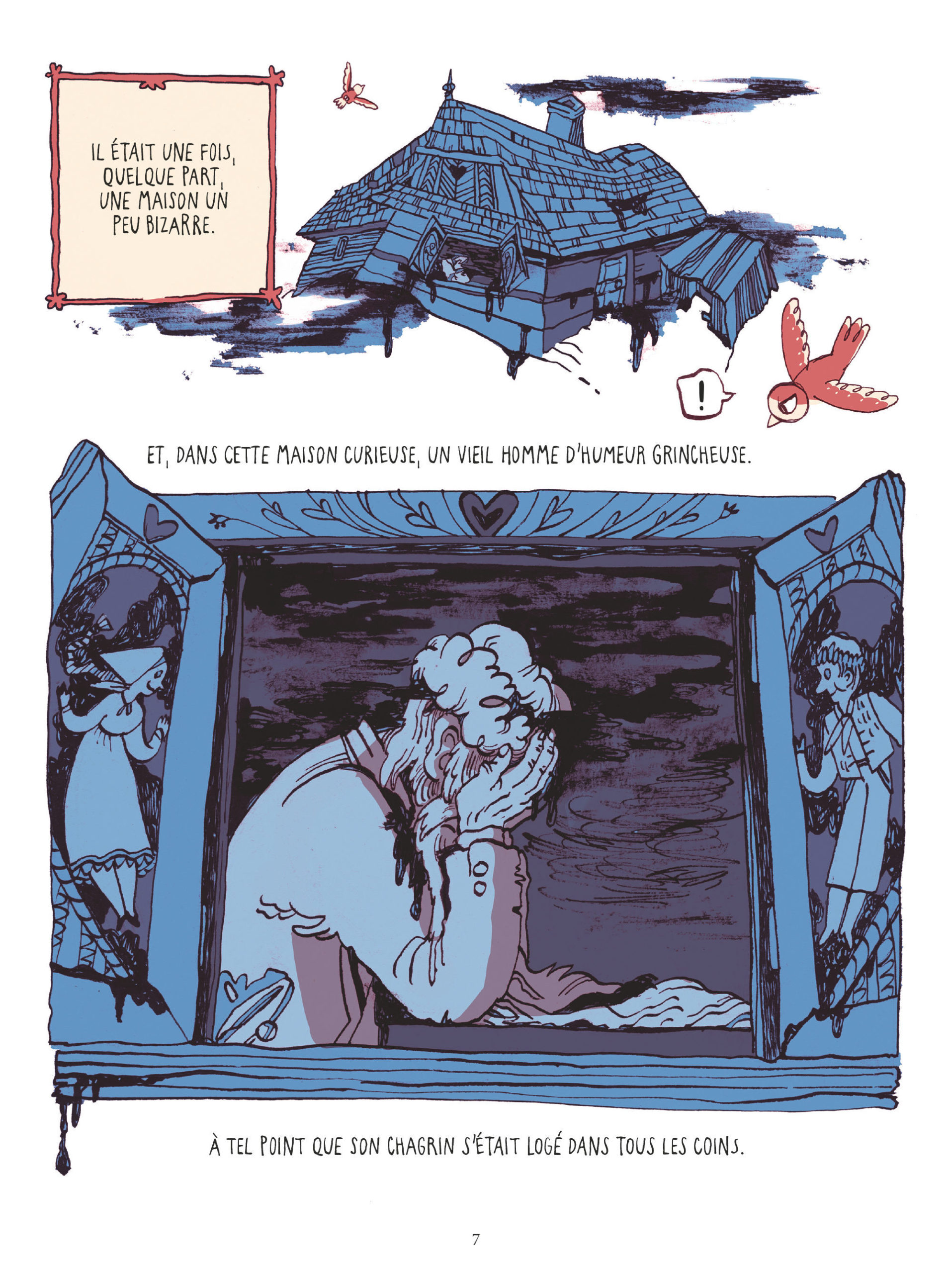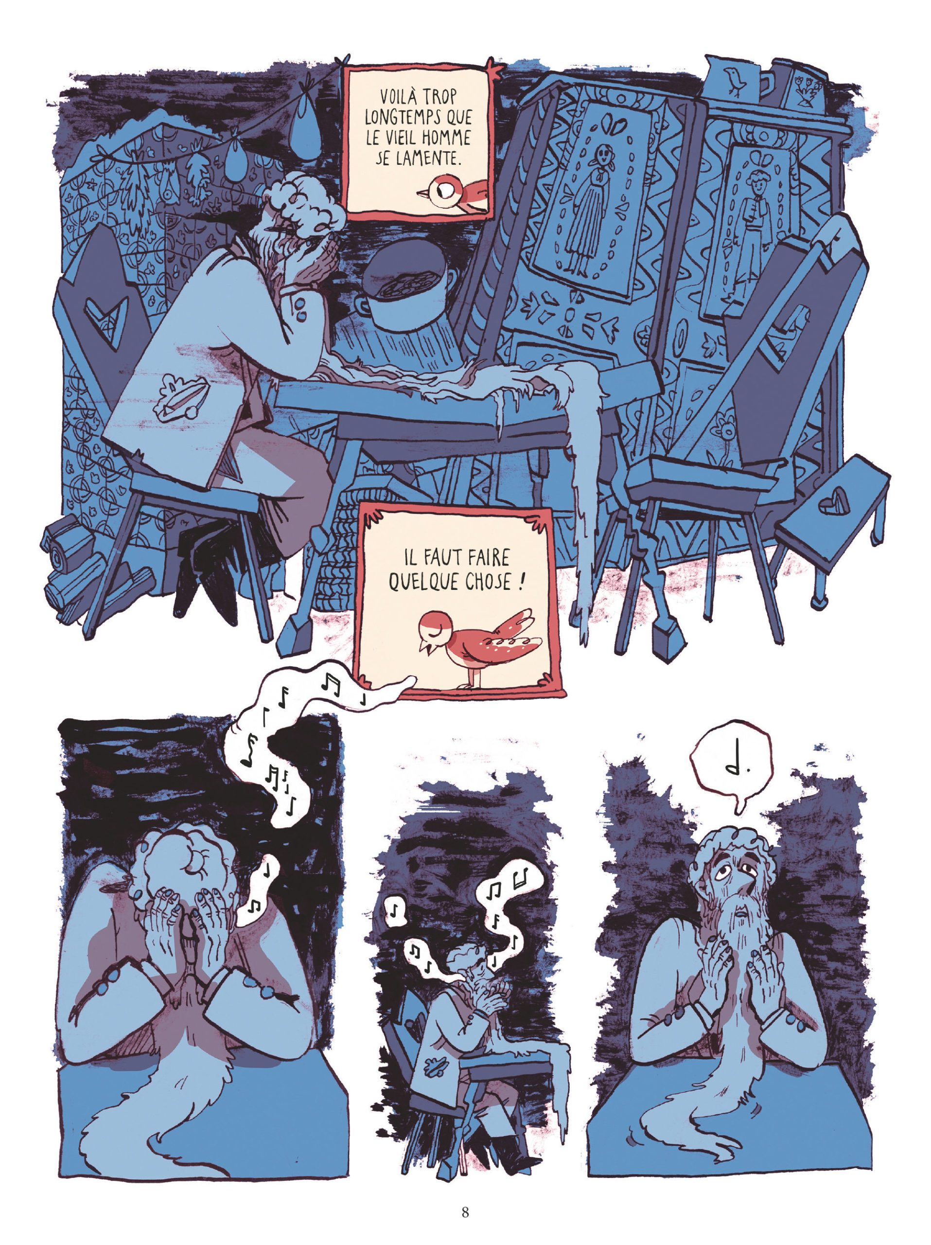 Un homme pleure. Il a tellement de chagrin, qu’il ne se rappelle même plus ce qui le rendait de bonne humeur ! Mais soudain, un petit oiseau aux ailes rouges rentre dans sa salle à manger. Il commence à siffloter gaiement son chant, ce qui a pour effet de sortir le vieil homme de son chagrin. Il se rappelle. Oui, il se rappelle à présent ce qui le rendait heureux !! C’était de jouer de sa flûte. Il faut absolument qu’il la retrouve, et, pour ne pas oublier une nouvelle fois, il fait un nœud à son torchon. Puis, emporte ses objets magiques dans son sac à dos, pour un périple à travers les villages.