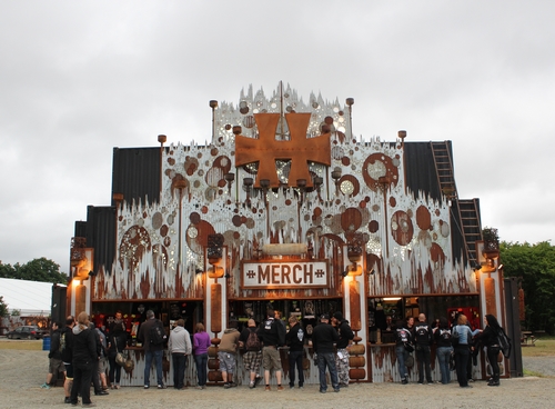 S’il est offert une grande variété au niveau de la restauration et que de nombreux merchs (boutiques) et bars sont présents, reste une question existentielle : Pourquoi y a-t-il si peu de WC ? Ben Barbaud nous explique que cela vient d’une part du manque de prestataires dans ce domaine, qu’il faut tenir compte du fait que le Hellfest a lieu sur des terrains privés (impossible donc de raccorder plus de WC) et que des WC secs (comme on en voit au Motocultor par exemple) signifieraient trouver des bénévoles acceptant de s’en occuper à temps plein … Notons le bel effort des toilettes filles qui permettent aux festivalières de bénéficier (en contrepartie d’une attente un peu plus longue) d’un réel confort.