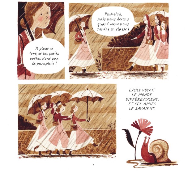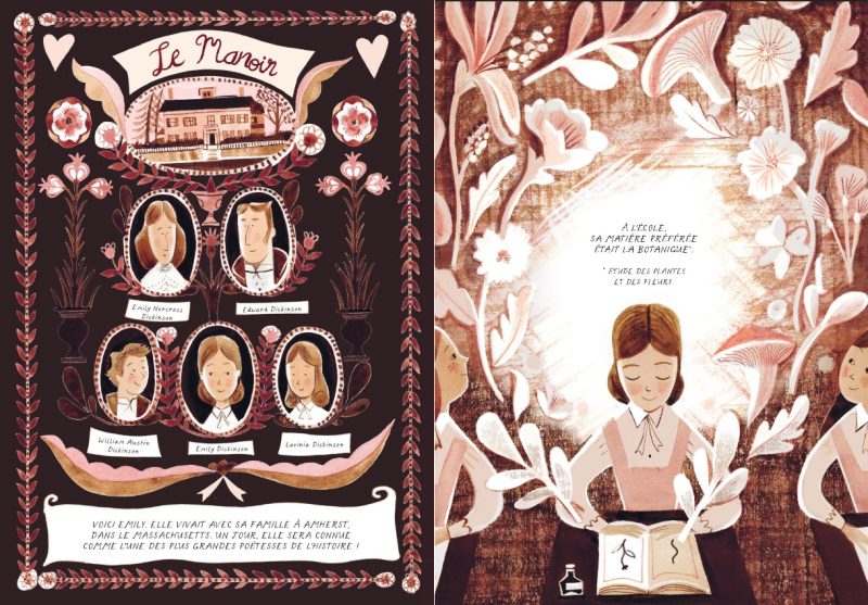 Une biographie « poétisée » de la jeunesse d’Emily Dickinson, aux graphismes lumineux et doux qui nous apprend à voir à travers les yeux de la jeune poétesse !