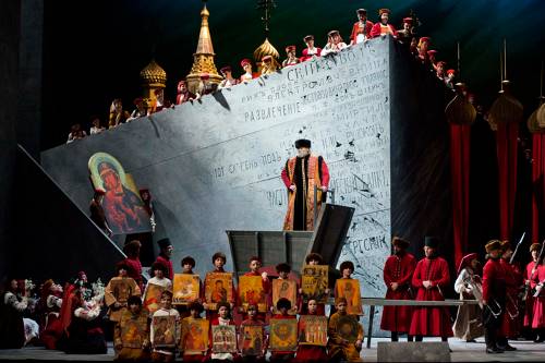 Pour illustrer la complexité d’affrontements politiques doublés d’un conflit religieux, lAndrei Serban a pris le parti de présenter ce mélodrame à travers une série de tableaux scéniques aussi riches en détails et ornements que peuvent l’être les grandes fresques historiques. Un travail de scénographie monumentale où le rideau est baissé cinq fois lors des cinq changements de décors. Des plateaux aussi imposants que somptueux, comme celui de la place rouge à Moscou, les appartements du palais ou la pinède, décors gigantesques qui sont autant le théâtre d’un mélodrame sentimental que l’affrontement de deux mondes : celui des progressistes, les nouveaux orthodoxe, et celui des conservateurs, les Vieux Croyants.