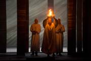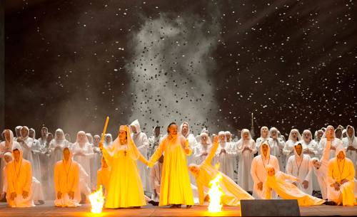 Coté voix, on a plaisir d’entendre Dmitry Belosseslkiy qui campe un Dossifei magistral par la splendeur de son timbre, doublé d’une belle présence scénique. Son fanatisme monte en puissance tout au long la partition et en devient encore plus inquiétant. Grand plaisir aussi d’écouter Evgeny Nikitin qui endosse le rôle de Chaklovity (magnifique aria de l’acte III) ou Sergei Skorokhodov, excellent dans le rôle du prince Andrei Khovanksy : le ténor nous bluffe par la solidité de sa voix aux aigus impressionnants, par sa présence animale qui colle parfaitement au personnage. Face à lui, Anita Rachvelishvili impressionne dans le rôle de Marfa. Dans le registre des graves, son chant est plein, puissante, on sent le feu intérieur la ronger quand elle songe à son amour pour le Prince Andrei qui l’a trahie. Quand elle chante sa vision du bûcher sur lequel elle et son ex amant mourront, la voix devient envoutante, vibrante d’émotion. Les scènes intimistes succèdent aux grands chœurs qui nous donnent la chair de poule, notamment dans ces scènes de foule (Streltsy, Moscovites ou « Vieux croyants »). Belle surprise aussi que la scène celle de l’acte IV où les esclaves persanes dansent autour d’Ivan Khovanski. Malgré des changements de plateau un peu long, la mise en scène reste fluide (plus de 120 artistes sur scène !) magnifiée par de magnifiques éclairages ( comme ces somptueux clair obscur dans la pinède ! ) et nous tient en haleine jusque dans la scène d’autodafé finale où les Vieux-Croyants s’immolent par le feu pour échapper aux soldats du tsar. Si on ajoute à cela un mariage qui allie costumes d’époque (ceux des Mousquetaires sont sublimes !), la musique imposante et majestueuse de Modeste Moussorgski et une direction d’orchestre confiée à la baguette de Hartmut Haenchen, ces 8 nouvelles représentations raisonnent déjà aux airs de triomphe.