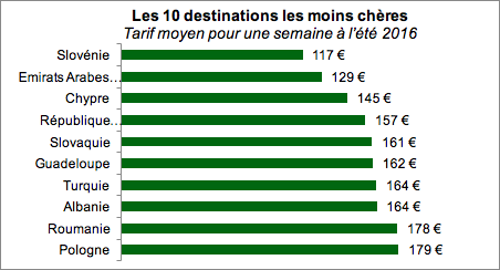 Parmi les destinations les moins chères, certaines ont tout de même « pris de la valeur » par rapport à l’été 2015, d’autres, au contraire, se sont effondrées. Si la Slovaquie a connu une hausse de 11 % et la Guadeloupe de 10 %, l’Albanie (- 25 %), la Roumanie (- 25 %), Chypre (- 12 %), la Turquie (- 10 %), les Emirats (- 9 %), la Slovénie (- 7 %) et, dans une moindre mesure, la Pologne (- 3 %) et la République tchèque (- 1 %), ont plongé.