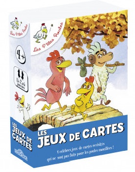Les p’tits poules sont à retrouver dans une boîte de jeux de cartes, des éditions Les livres du Dragon d’Or. Un concept inédit, avec cette boîte pratique qui renferme quatre jeux de cartes amusants, revisités et personnalisés à l’univers de la licence.
