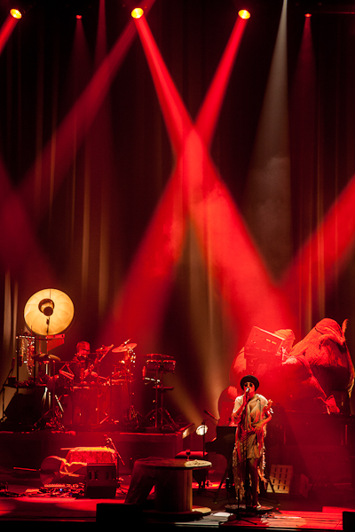 Une voix douce, un charme et un envoûtement légèrement  rétro : l’envoûtement est direct !! Chaque récital de cette jeune crooneuse américaine aux frontière du jazz, du folk et de la bossa est unique. Elle swingue avec désinvolture, nous câline et nous arrache immanquablement d’énormes frissons. Melody Gardot entretient sa grâce coûte que coûte malgré de lourdes séquelles dues à un très grave accident à l’âge de 19 ans. Ses premières compositions verront le jour lors de son rétablissement grace a la musicothérapie … elle commence sont concert  Dans la pénombre  qui nous la fait apercevoir plus que vraiment voir, debout, elle tape du pied en rythme, claque des doigts pour le rythme et chante a capella une sorte de blues gospels, Excessivement élégante, expérimenté jusqu’à l’étourdissement, Melody nous envoûte de ses litanies, avec cette voix de velours poudrée de satin qui est  maintenant légendaire.