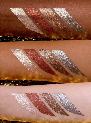 Et il y en a pour tous les goûts : 7 teintes au total. Autant vous dire qu’il y a de quoi s’amuser. De mon côté, j’ai reçu le fard « Smouldering Seduction » qui envoie du lourd ! Il s’agit d’un marron métallisé assez intense. J’ai eu peur au départ de sa couleur foncée, et puis finalement, il est assez modulable, allant du métallique au pailleté. Il est superbe ! Quant aux autres couleurs, elles sont moins foncées, mais tout aussi métallisées, n’hésitez pas à jeter un coup d’œil à la photo ci-dessous pour les découvrir plus en détail.
