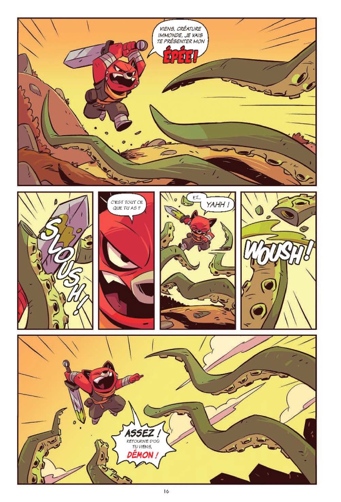 Un peu d’humour Anglais, et un chara-design que l’on connait bien : Derek Laufman, l’auteur, bosse déjà pour des grands comme Marvel, Warner Bros ou Disney. Du coup, on a sous les yeux des personnages aux traits arrondis animation like, aux truffes et au groin bien sympathiques !! Et très caractéristique des héros de quêtes mais, en plus losers ! Quant au scénario, il est plein de surprises : l’auteur fait mumuse avec nos nerfs, en faisant des «climbing up » à chaque « partie » de l’histoire … Dés que l’on croit que les persos sont sortis d’affaires, un nouvel élément vient s’ajouter à l’histoire et on repart de plus belles jusqu’au final !! Bref, de l’enjoy et du fun avec des dialogues qui vous feront ricaner tout seul dans votre petit fauteuil propet !