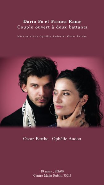Avant toute chose, Oscar Berthe a tenu absolument à nous dire qu’il faisait partie de l’école de théâtre d’Eva Saint-Paul à Paris. « Une petite école avec peu d’élèves. C’est comme une famille !», nous a-t-il confié. Depuis quatre ans, il joue et travaille avec la même équipe, les mêmes comédiens. C’est dire si l’esprit de troupe est très important pour lui. Avec Ophélie Audon, il vient de mettre en scène « Couple ouvert à deux battants », l’une des pièces les plus connues de Dario Fo, prix Nobel de littérature en 1997. L’idée de cette pièce qui met en scène un couple lui est venue après une séparation. « Je devais lire cette pièce depuis longtemps ; elle était sur mon armoire. Je me suis retrouvé seul chez moi et je l’ai lue en une heure. J’ai ri mais aussi pleuré ! ». Il a alors eu envie de la mettre en scène. Après avoir été jouée à Paris, la pièce ira sur d’autres scènes et très probablement à Avignon cet été.