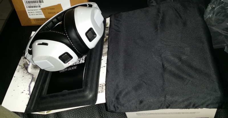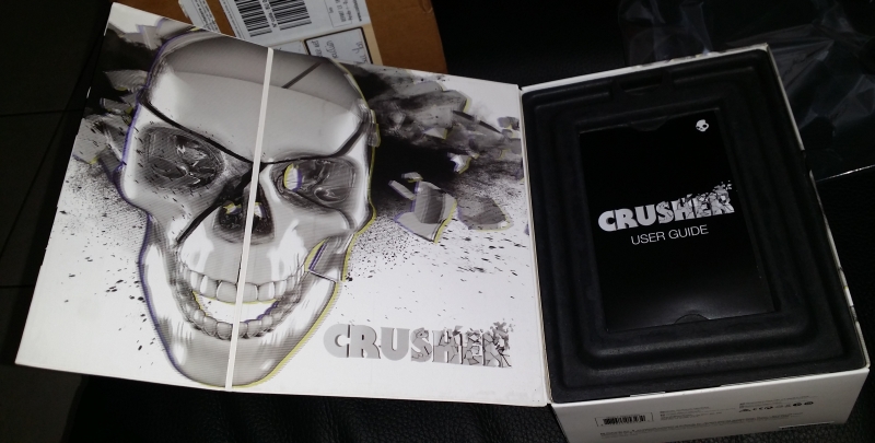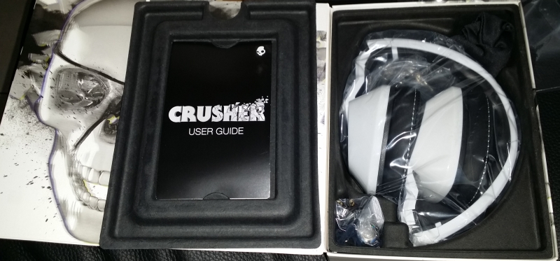 A l’intérieur, le casque, un câble jack pour le brancher sur un appareil audio, et une pile ainsi qu’un mode d’emploi dans un écrin. Tout ça donne bien l’impression d’un appareil haut de gamme, on est loin des packagings à la va vite que certains constructeurs se permettent sous prétexte que c’est « de l’entrée de gamme ». Un rapide coup d’œil sur le mode d’emploi, ce que j’avais au début pris pour un bouton de réglage de volume est en fait un réglage du niveau de Basses. Il n’y a donc pas de réglage de volume directement au casque, cela ne me dérangera pas plus que ça : j’utilise essentiellement le casque sur mon ordinateur qui a un réglage de volume accessible au clavier et sur ma phablette sur laquelle j’ai headset button controler qui me permet de régler le son directement avec le bouton de décrochage d’appel du casque. Ça tombe bien, le Crusher a un micro et un bouton de décrochage sur son fil. Mais je rentre du travail et il est déjà tard, on testera le casque en live demain, sur le trajet au boulot.