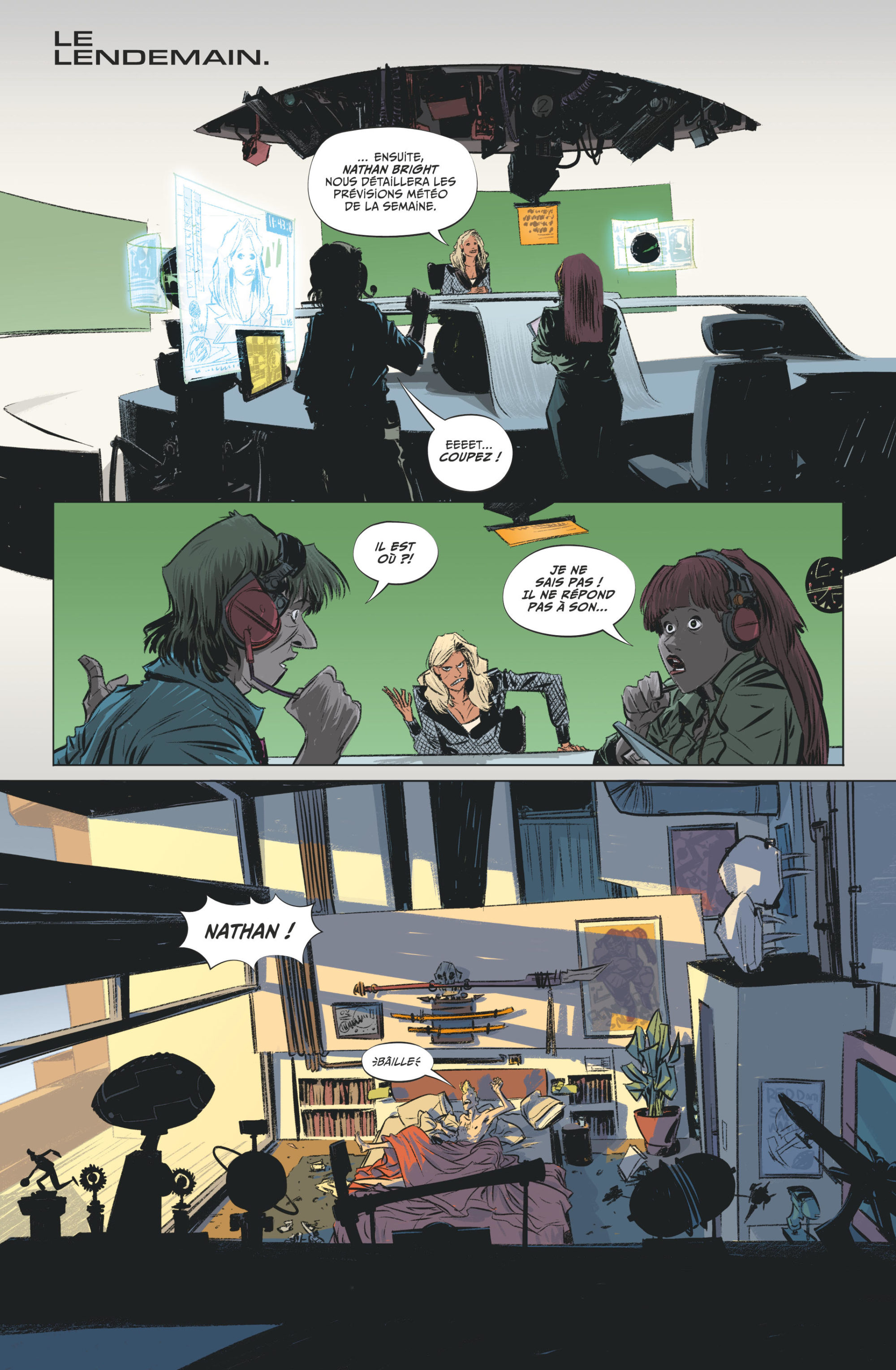 Le lendemain … Sur le plateau de diffusion des infos, il manque encore Nathan Bright ! On découvre le fainéant Monsieur météo, toujours dans son lit, avec sa fidèle compagnonne : Saddie (son clebs). Après s’être fait passer un savon par la production, il file nonchalamment avec son chien, afin d’enregistrer sa prestation. Et quelle prestation ! Monsieur Nathan Bright s’est fait un nom grâce à l’originalité de sa présentation météo !!!  Mais tout le monde n’est pas de cet avis. Dans le vaisseau approchant Mars, les gueules de tueurs n’ont qu’un mot d’ordre : récupérer LA cible !
