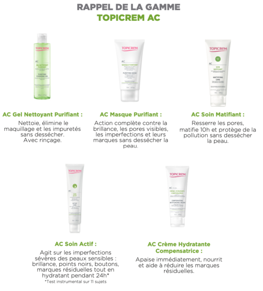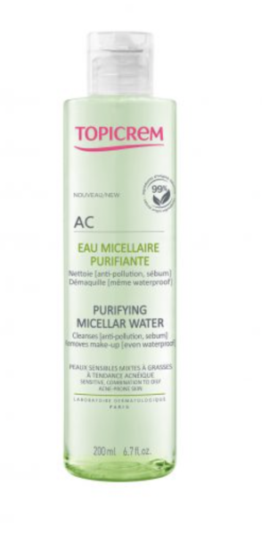 Topicrem a créé une gamme spéciale pour les peaux sensibles mixtes, grasses et à tendance acnéique : c’est la gamme AC qui comprend plusieurs produits (dont l’eau Micellaire Purifiante). Dans cette gamme, vous aurez un soin matifiant, un gel nettoyant, un masque purifiant, une crème hydratante compensatrice, un soin actif et une eau micellaire. Le tout pour avoir une belle peau !
