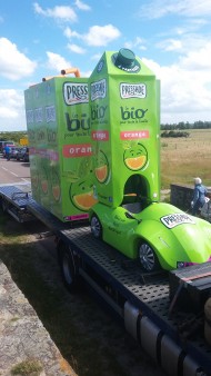 La seule pause autorisée s’effectue à mi-parcours ; il vaut mieux prendre ses précautions avant le départ. A peine 5 min et c’est reparti, il faut ensuite remonter la file des véhicules jusqu’à la position de la caravane Teisseire entre Kleber et les galettes Saint-Michel. La remontée est l’occasion de se restaurer, la vitesse est trop élevée pour lancer des cadeaux. La gestion du stock préoccupe Maxime, Il faut en garder pour les derniers kilomètres où le public est très nombreux.