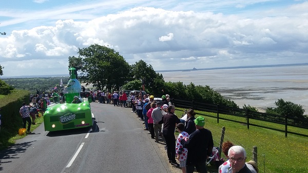 Les premiers kilomètres sont magnifiques, le parcours longe les côtes normandes avec vue sur la baie du Mont Saint-Michel depuis les hauteurs des falaises de Champeaux. La traversée des villes et villages, dont Avranches, Granville, Blainville sur Mer ou encore Lessay s’effectue dans une réelle ambiance de fête et le ciel menaçant de la matinée a laissé place au soleil, devant une foule toujours plus nombreuse. Le vent oblige les caravaniers à s’équiper chaudement.