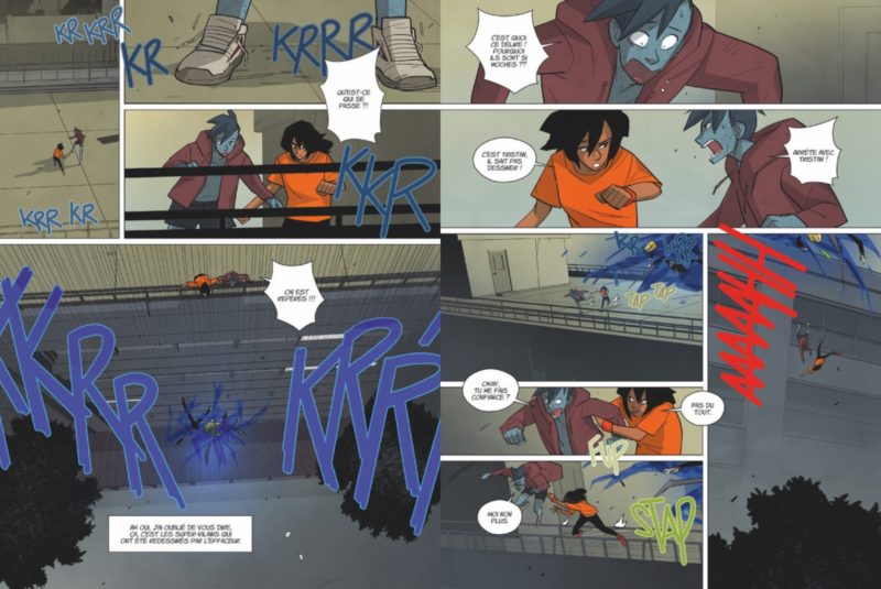 Pour une fois, Tristan fait preuve d’une inventivité folle afin de fuir. En tombant, il ouvre un passage vers la bibliothèque du lycée, grâce à un zipper. Alors que tout peut se passer normalement, il oublie de refermer cette « fermeture éclair » magique, et d’autres super-vilains débarquent. Que voulez-vous ? N’est-pas héros qui veut, et Tristan cumule malheureusement les bourdes. Ce qui a souvent pour effet d’énerver sa compagne de fuite !!! Enfin, c’est une nouvelle fois le temps de se barrer en vitesse, en ouvrant zip sur zip, et se téléporter à différents endroits.