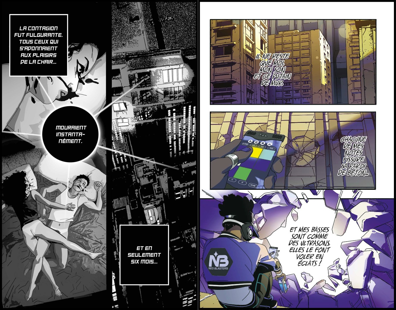 Kenzell étouffe dans cette jungle urbaine bien trop restreinte, sur cette île nommée Neopolis. Il rêve d’évasion, de liberté. Briser et passer ce foutu mur ancestral censé le protéger, lui et les autres gangs d’hommes, de ce putain de virus. Sur les toits, il observe les buildings à perte de vue, le mur, et puis la mer. Heureusement, grâce à sa musique, il parvient à tenir le coup pour continuer. Et, à sa grande surprise, son pote lui apprend que ce soir, il a été choisi pour donner le show dans l’Urbance, le plus grand club de Junk Town !